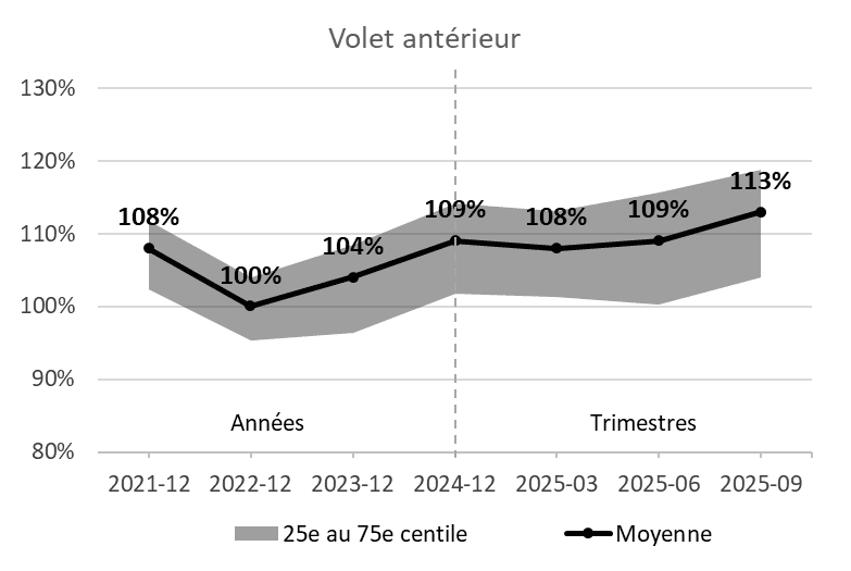 - Volet antérieur : 105 % au 30 septembre 2025, en hausse de 3 % au cours du troisième trimestre et de 5 % depuis le début de l’année