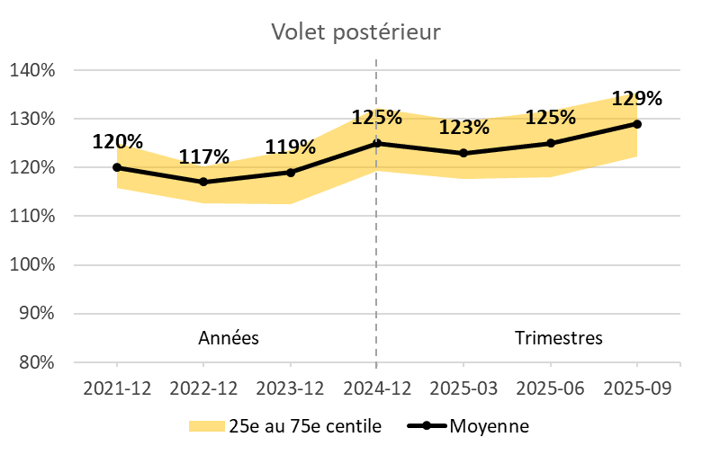 - Volet postérieur : 116 % au 30 septembre 2025, en hausse de 6 % au cours du troisième trimestre et de 7 % depuis le début de l’année