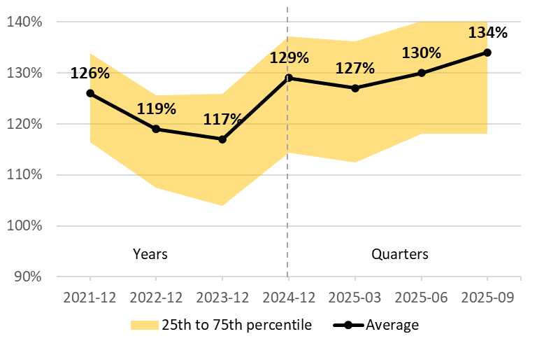After remaining relatively stable in the first half of the year, the average funded ratio improved in Q3 2025. The average solvency ratio also improved over Q3, maintaining the positive trend that began at the start of the year.